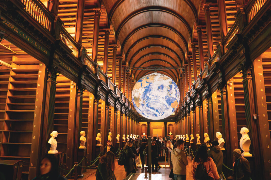 Words from the past animate cities and landscapes in Ireland: those by Oscar Wilde, William Butler Yeats, George Bernard Shaw, and—most famously in Dublin—James Joyce. The James Joyce Centre, situated in an eighteenth-century town house in a lovely Georgian neighborhood, is filled with Joyce memorabilia, including the door of No. 7 Eccles Street, the home of the fictional Leopold Bloom, from which he launched his Ulysses adventure. The center also offers two-hour walking tours, including the “Footsteps of Leopold Bloom,” on Thursday, Friday, and Saturday mornings. Stepping back further in time, few volumes are as beloved as the ninth-century Book of Kells, with its four Gospels lavishly illustrated by Celtic monks. It’s on display at Trinity College in the heart of Dublin. You’ll not just see the book, housed with all the reverence befitting crown jewels, but learn its backstory through an immersive digital experience.