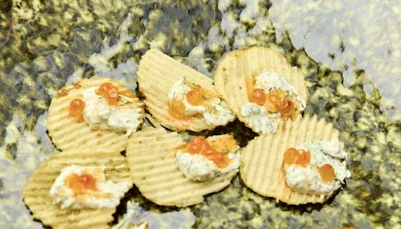 Sour cream and onion caviar dip served on a potato chip, a recipe from the April/May issue.