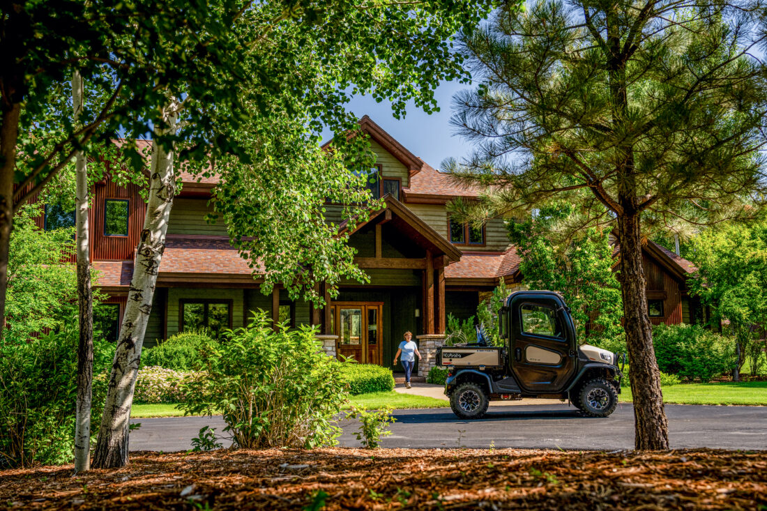 A Kubota utility vehicle outside a home.