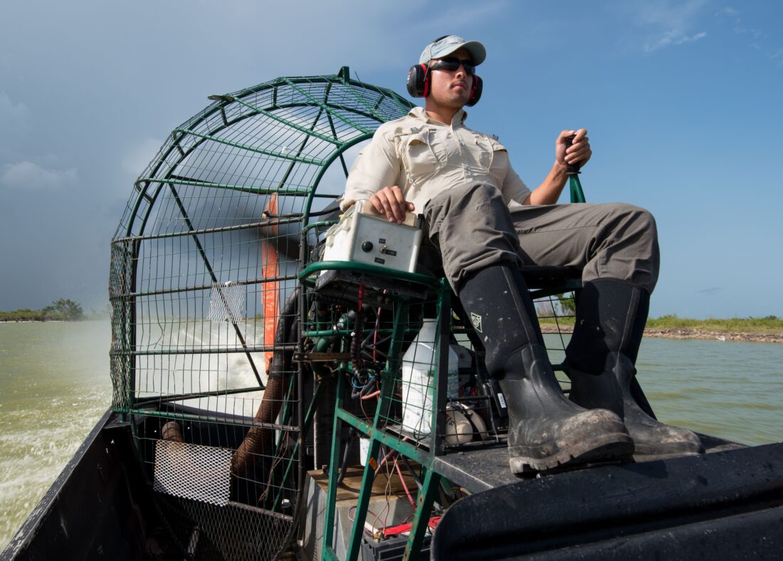 It’s a hot July night, and Mike Lloret and his crew are racing through the dark on an airboat. Miami’s high-rises offer but a distant, faint night-light, and Lloret wears a headlamp to illuminate his surroundings—a canal stretching straight as a runway with buttonwoods clinging to its high, muddy banks. Forty yards ahead, in a flash, he spots a pair of red eyes spaced no farther than an inch apart. He whips the boat starboard and cuts the noisy engine at just the right moment. A crewmate hanging from the bow reaches into the water and scoops up a hatchling crocodile.