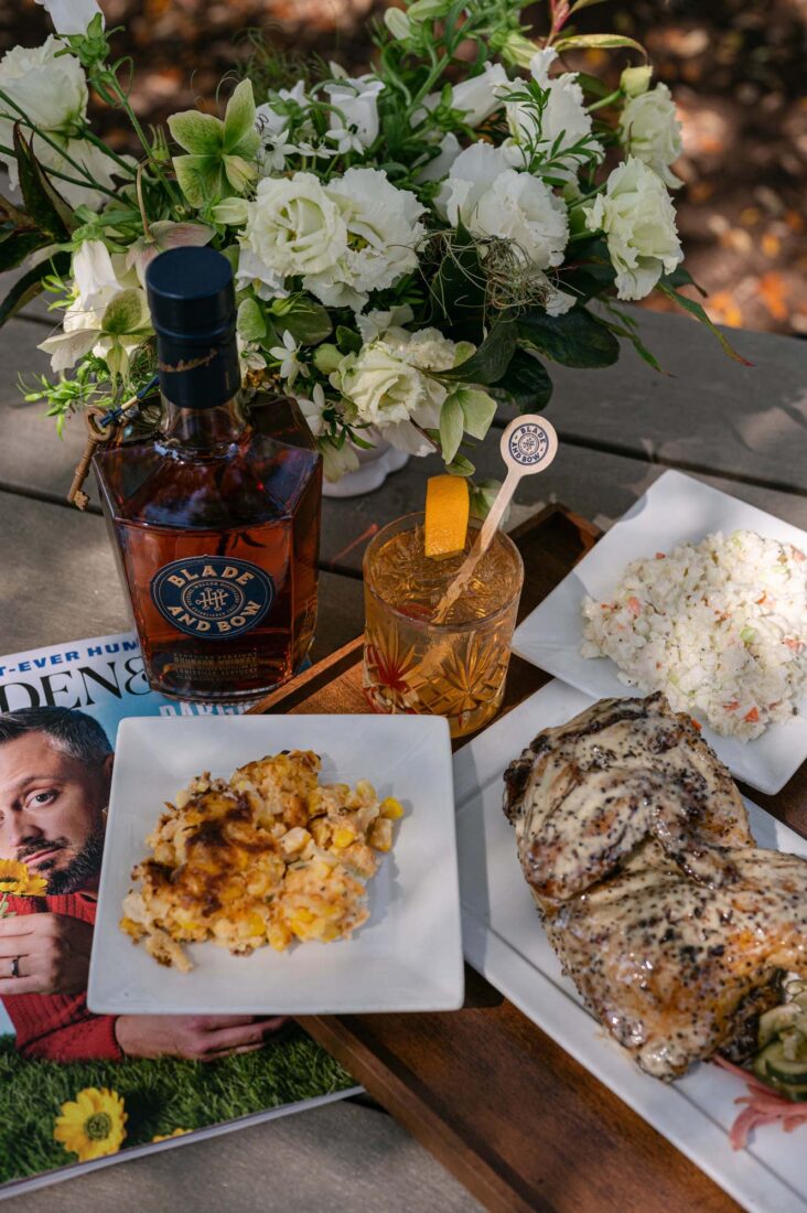 The New Fashioned cocktail, featuring Blade and Bow Kentucky Straight Bourbon Whiskey, elderflower liqueur, and soda, paired with smoked chicken and fixings from Swig & Swine BBQ.