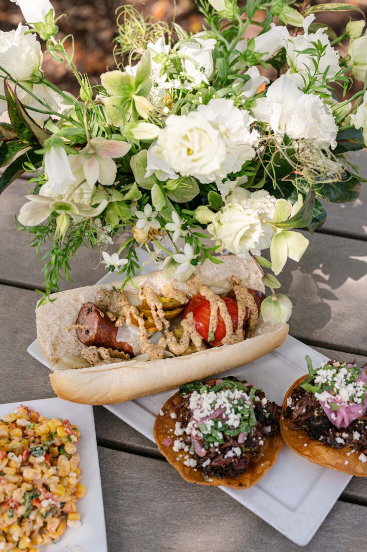 A smoked house sausage sandwich and barbacoa tostadas from Palmira Barbecue.