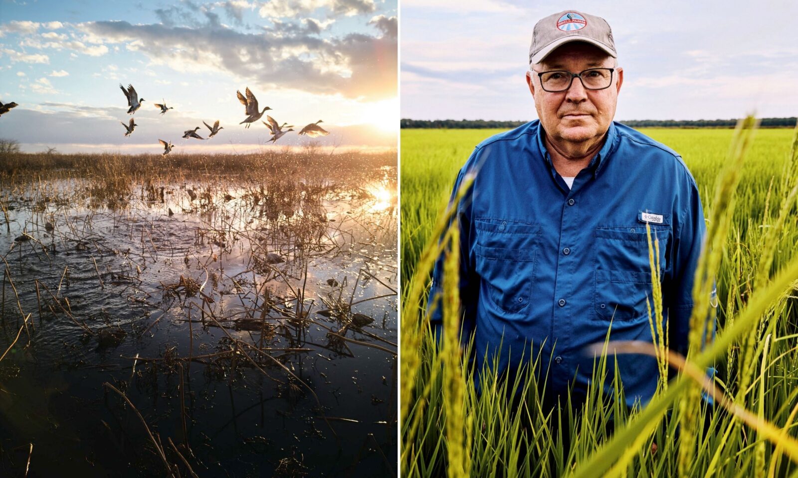 Pintails leave an Isbell Farms impoundment; fourth-generation farmer Chris Isbell stands in a rice field at his family’s Arkansas farm.