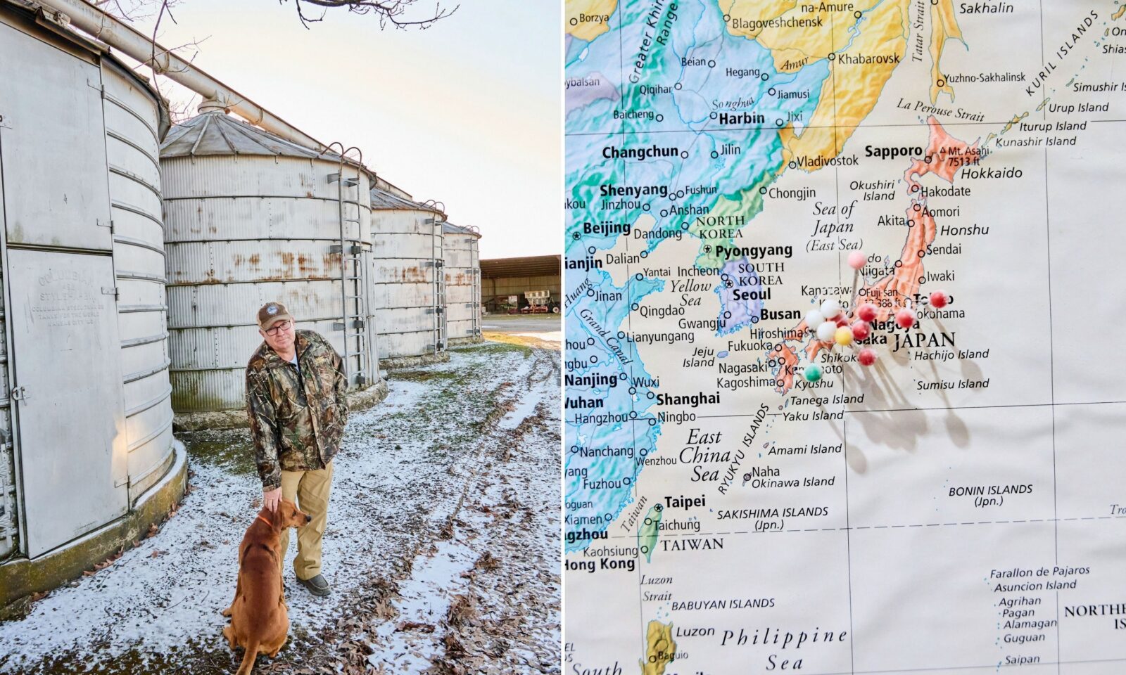Chris Isbell with one of the farm’s dogs; pins mark the home locations of Japanese visitors.