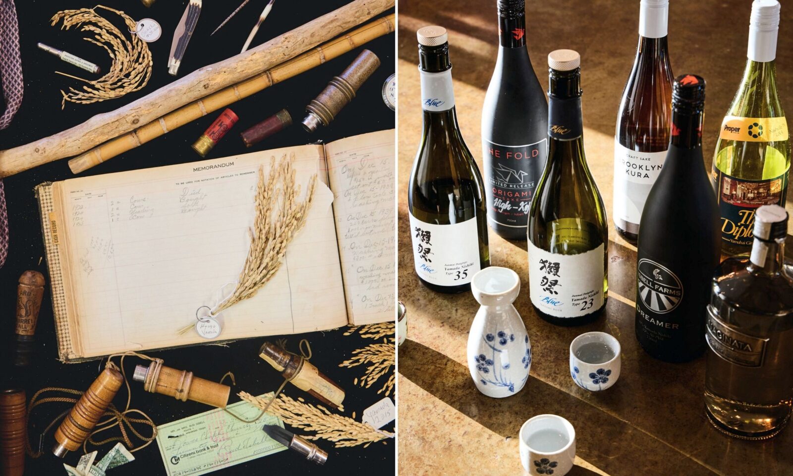 Duck calls and other family memorabilia displayed in a glass-top coffee table; a selection of sakes that use Isbell Farms rice.