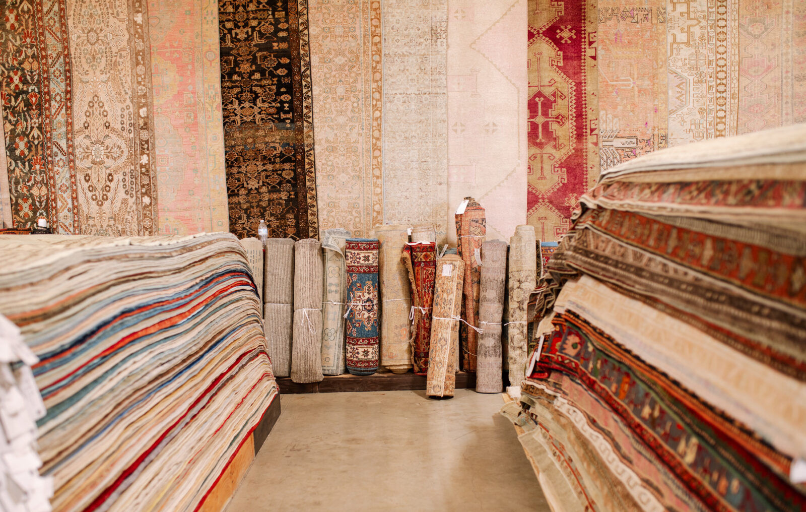 A rainbow of patterned rugs.