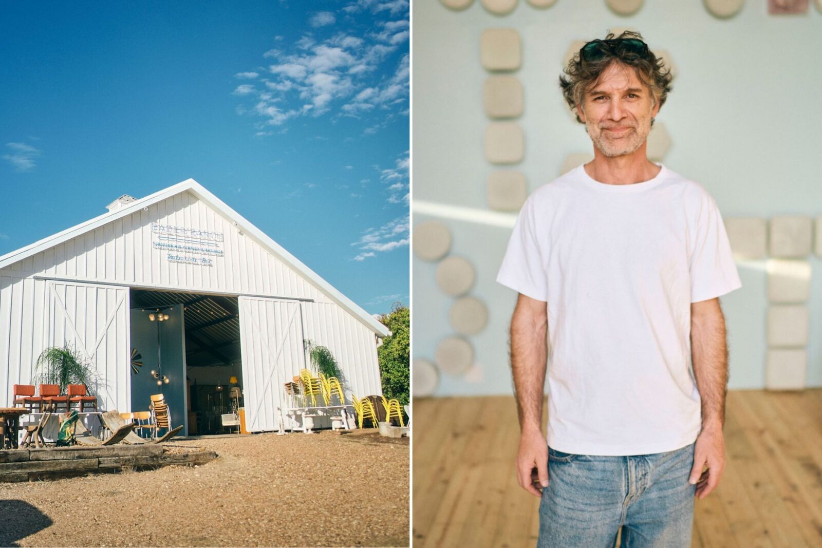 Midcentury furniture outside the Bader Ranch; antiques dealer Cyril Clerc.