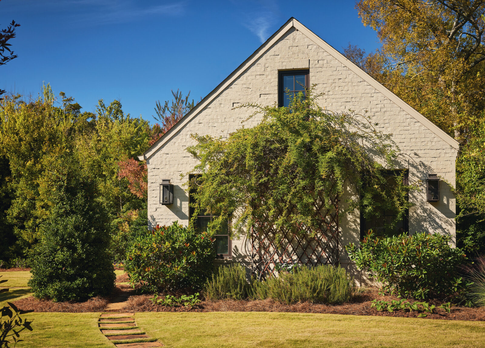 The artist’s cottage behind the house—HQ for Teil’s expanding projects, which, in addition to original paintings, now include textiles and wallpapers in her signature colorful style—took inspiration from Wolfe’s own workspace as well as the studio of fellow Georgia artist Susan Hable. Teil and Wolfe planned the space with whitewashed gallery-style walls, tall ceilings, and oversize windows that maximize natural light. “I loved how [Hable] covered the exterior of her workshop in flowers,” says Teil, who planted a tangle of hot pink Peggy Martin roses around her own cottage.