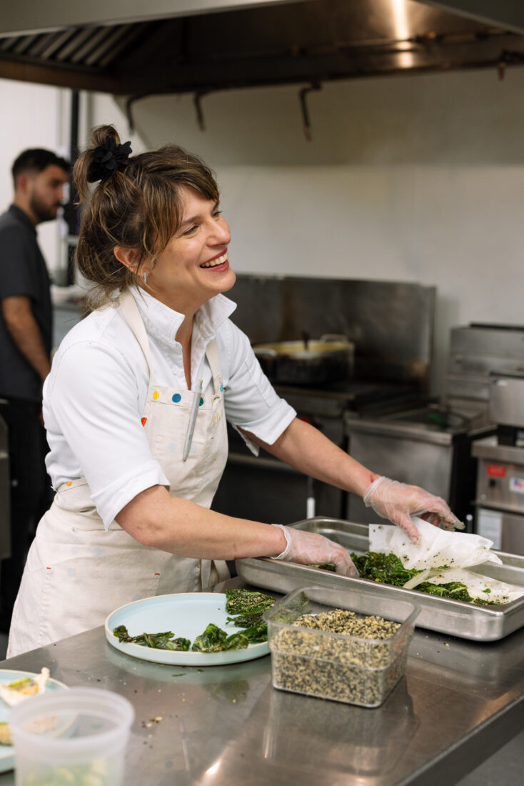 Chef Vivian Howard of Charleston’s Lenoir preps fried collards for cocktail hour.