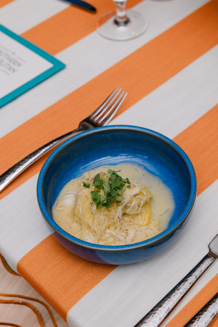 A savory second course of she-crab cacio e pepe with spaghetti squash and blue crab.