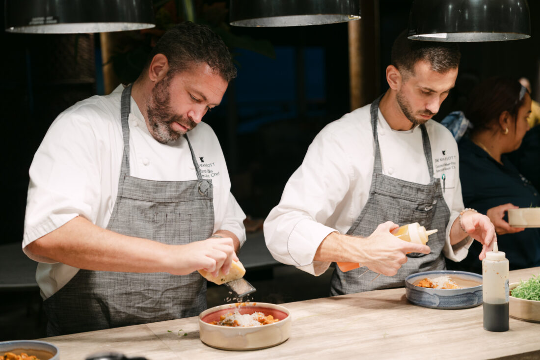 Executive chef Ellis and sous chef Nieberding garnish the third course: pasta alla aozzona with smoked brisket and cayenne.