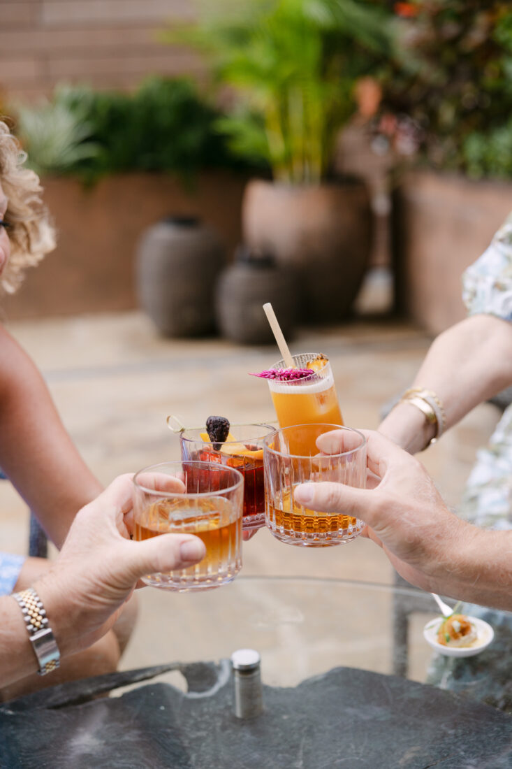 Guests raise their glasses with Penelope neat pours, Walnut & Fig cocktails, and the Summer in the Coastal cocktail with Penelope Wheated and creme de banana.