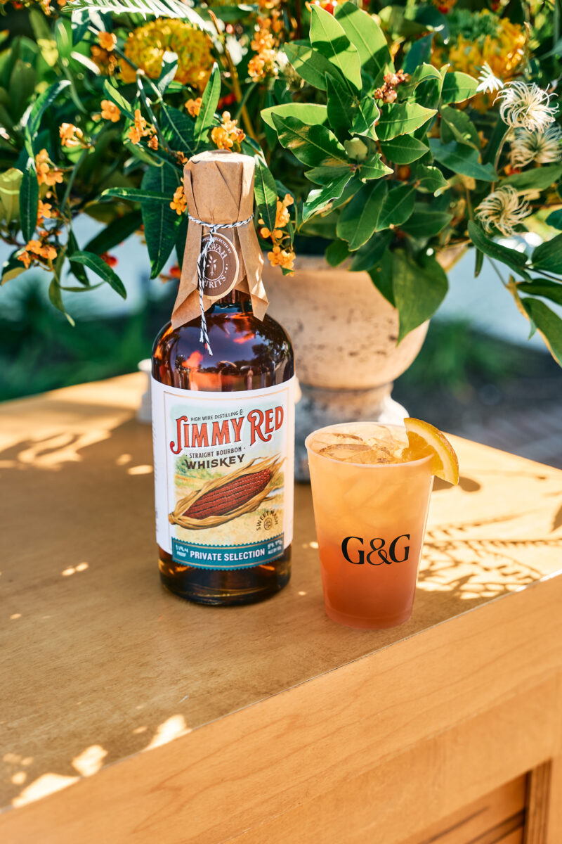 The Sporting Life cocktail, featuring High Wire Distilling Jimmy Red Bourbon Kiawah Spirits Private Selection with berry rooibos, grenadine, and lemon.