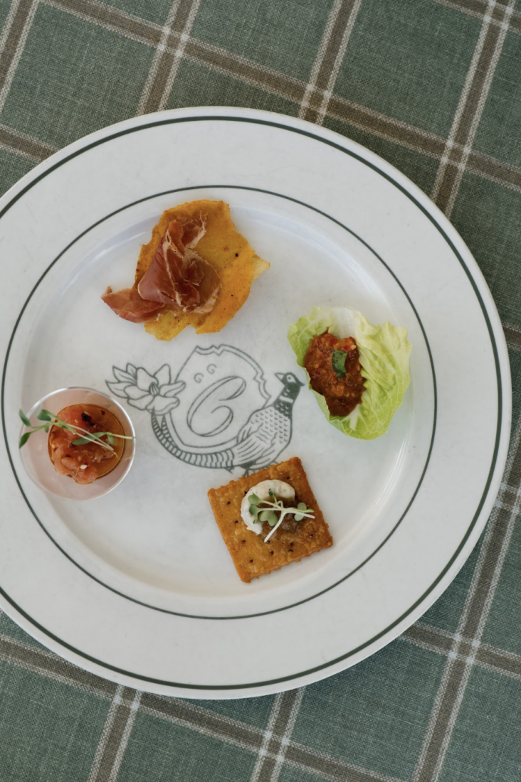 Snack pairings by chef Bilitzer, clockwise from left: tuna tartare with harissa broth, crispy shallots, and cilantro; Kentucky country ham & MeeshMeesh amba tuile with benne butter; black walnut muhammara sorghum; and smoked trout tillette with Burn Box onion jam and saltine.