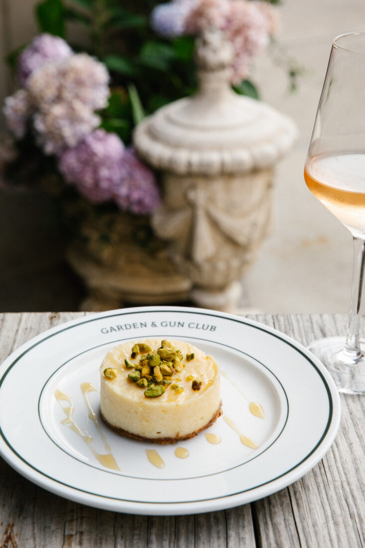 Goat cheese cheesecake with a ginger snap brown butter crust, pistachios, and honey.